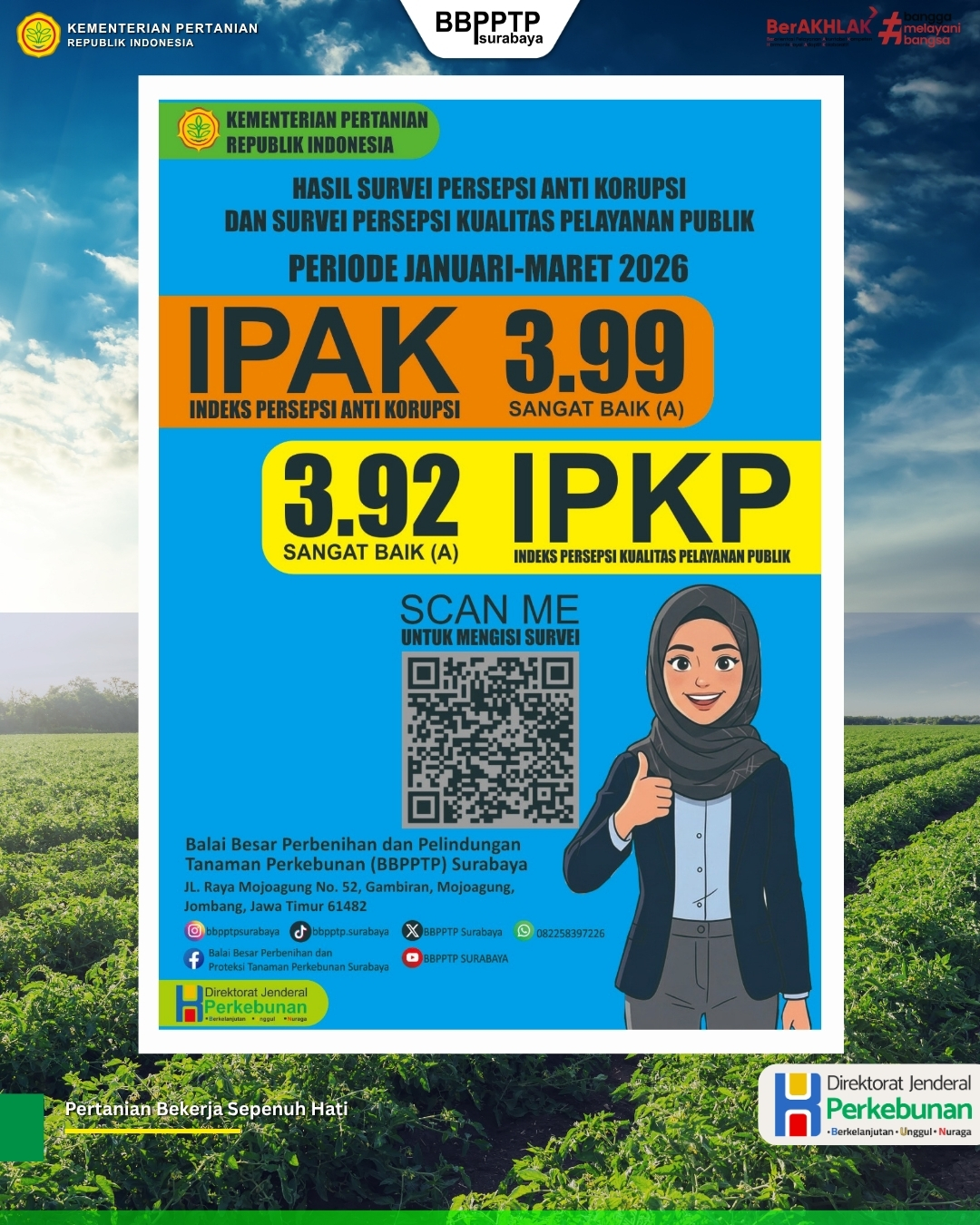 Diposting Tuesday, 28 April 2026 03:04 pmKementerian Pertanian RI melalui BBPPTP Surabaya mencatat capaian sangat baik pada periode Januari–Maret 2026, dengan nilai IPAK 3,99 dan IPKP 3,92. Terima kasih atas kepercayaan dan partisipasi Anda. Yuk, terus dukung pelayanan publik yang bersih dan berkualitas dengan mengisi survei melalui QR code!