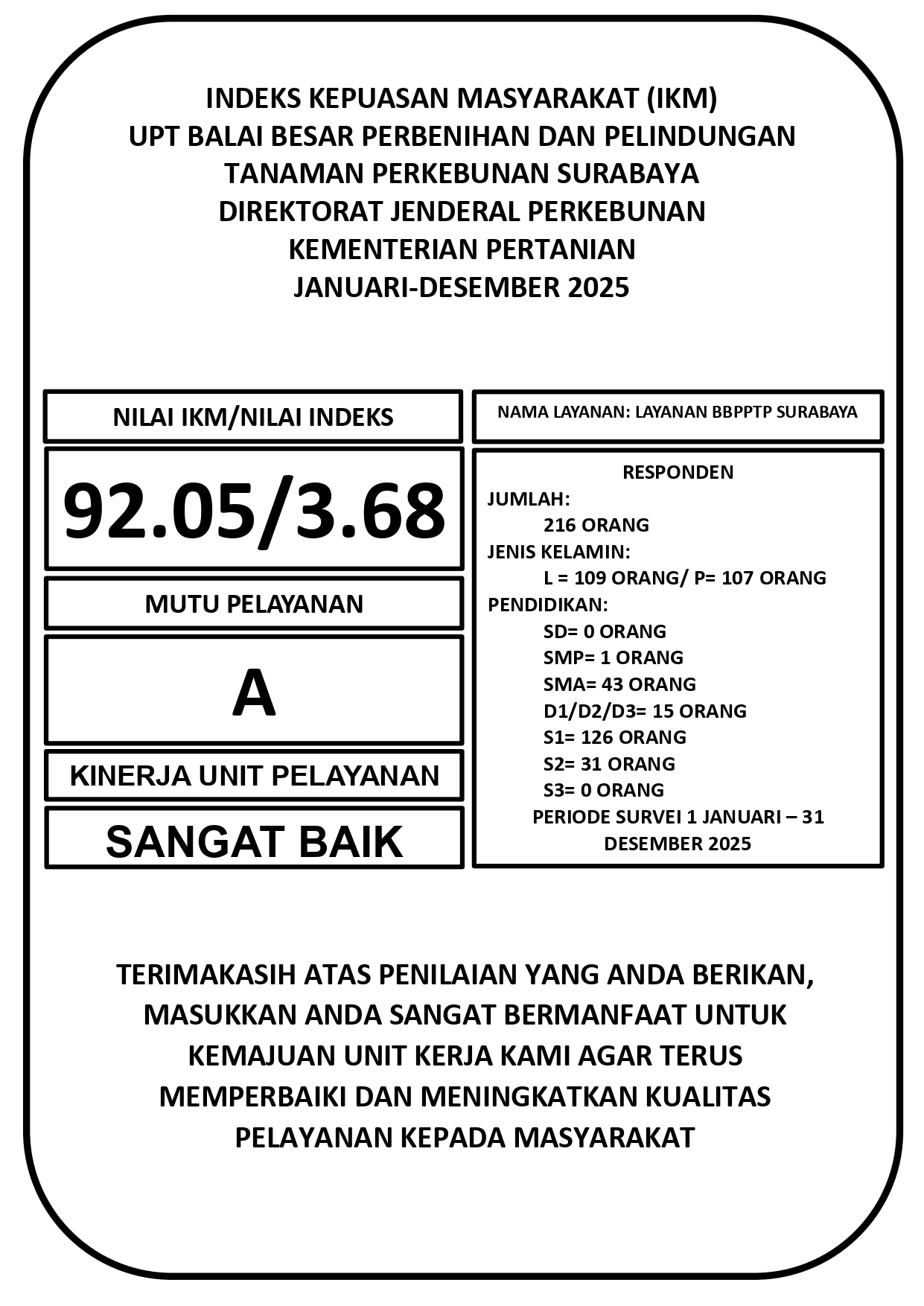 Capaian ini merupakan hasil penilaian dari 216 responden selama periode JanuariāDesember 2025.